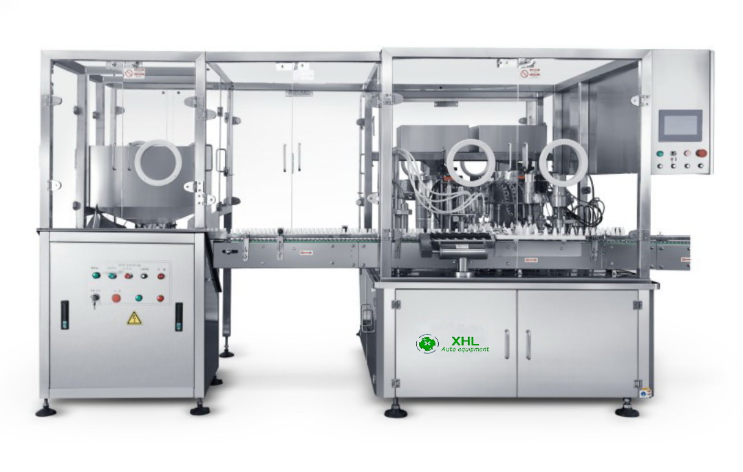 nitrogen filing before filling.When the bottle is detected by the bottle feeding photoelectric eye, the filling and lifting mechanism is pressed downward,the filling needle is inserted into the bottle, and the whole pump body liquid feeding and nitrogen filling head liquid discharging process is completed by the metering pump. After the filling is completed, it is subject to nitrogen fling.The lifting mechanism is raised, and the rotary table moves the bottle to the stoppling station. The stopple is sucked up by the stopple suction nozzle, which is driven by the cam to the top of the bottle mouth through circumferential movement(the bottle clamping station clamps the bottle mouth).The inner stopple is pressed downward into the bottle mouth.The rotary table takes the s toppled bottle to the capping station, and the cap suction nozzle takes the cap to the top of the bottle mouth. Carry out pre pressing. The rotary table takes the capped bottle to the cap turning station, and the cap is tightened by the cap turning head. The rotary table takes the bottle after cap turning out of the rotary table mechanism and sends it to the conveying mechanism,which sends the bottle to the next procedure.